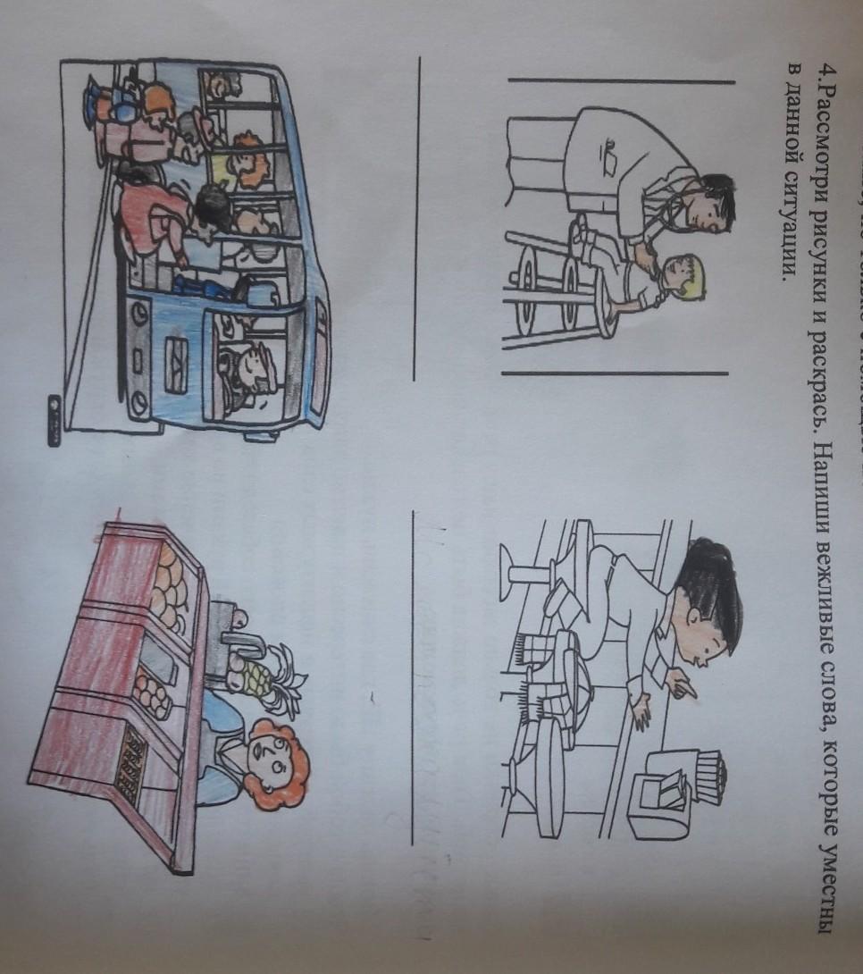 4.Рассмотри рисунки и раскрась. Напиши вежливые слова, которые уместны
