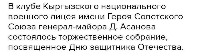 В клубе Кыргызского национального военного лицея имени Героя Советского Союза генерал-майора Д. Асанова состоялось торжественное собрание, посвященное Дню защитника Отечества.