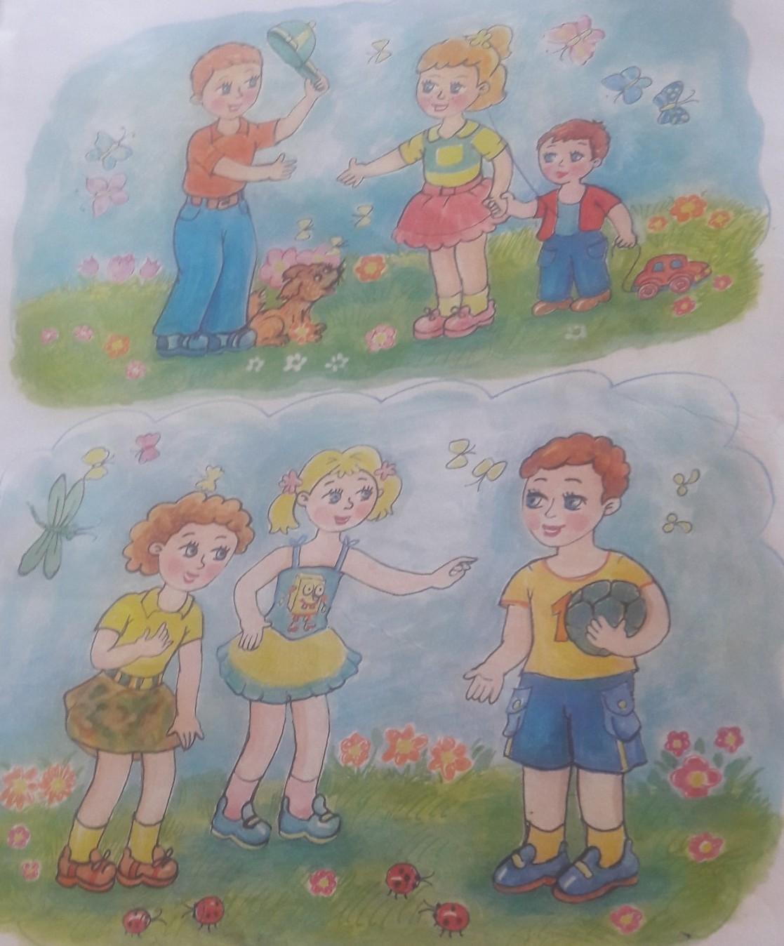 На первой картинке мальчик приветствует ребят и показывает свои хорошие манеры.