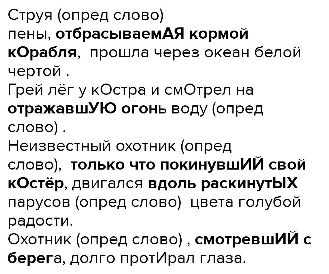 струя пены, отбрасываемая кормой корабля прошла через океан белой чертой. 2. грэй лег у костра и смотрел на отражавшую огонь воду. 3. дувший с моря ветерок трепал колючую хвою старого бора. 4. неизвестный охотник, только что покинувший свой костер, двигался вдоль реки. 5. охотник, смотревший с берега долго протирал глаза