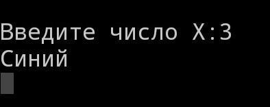 C клавиатуры вводится число x. Если число x=1, экран выводит сообщение "красный" x=2, то "зеленый" x=3, то "синий"
