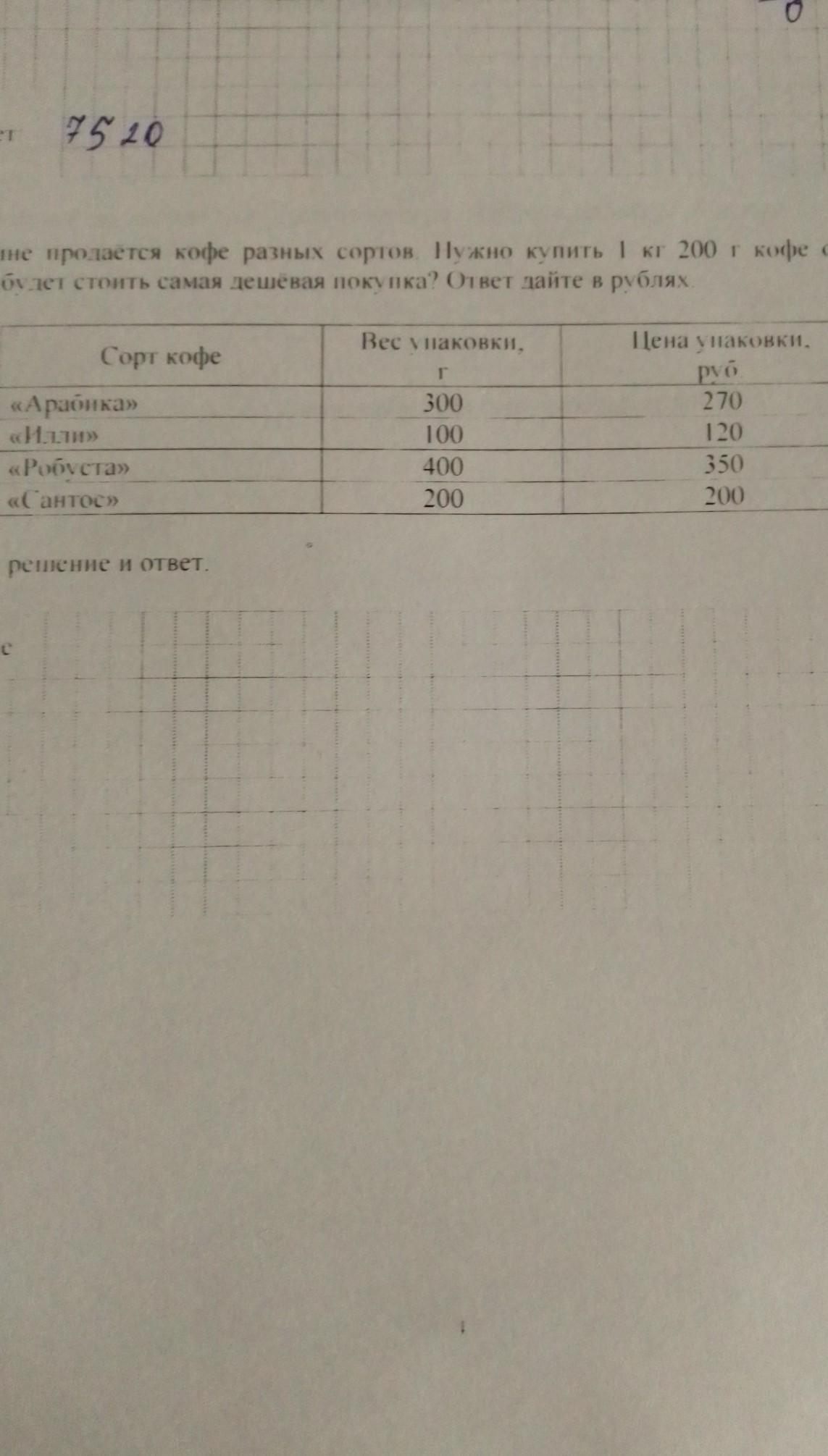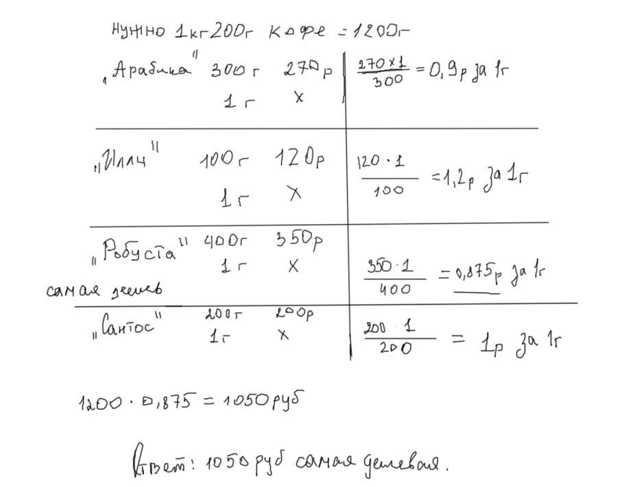 В магазине продаётся кофе разных сортов. Нужно купить 1кг 200г кофе одного сорта. Сколько будет стоить самая дешёвая покупка? Ответ дайте в рублях.