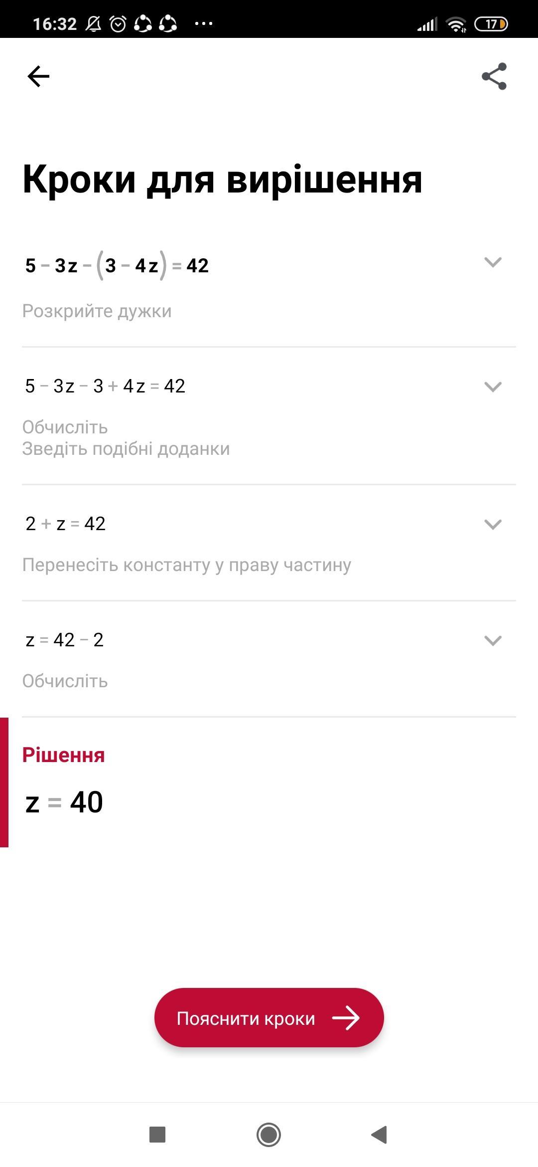 Сначала надо раскрыть скобки: 5-3z-3+4z=42; затем перенести все числа на одну сторону: -3z+4z=42-5+3; и просто посчитать 1z=40