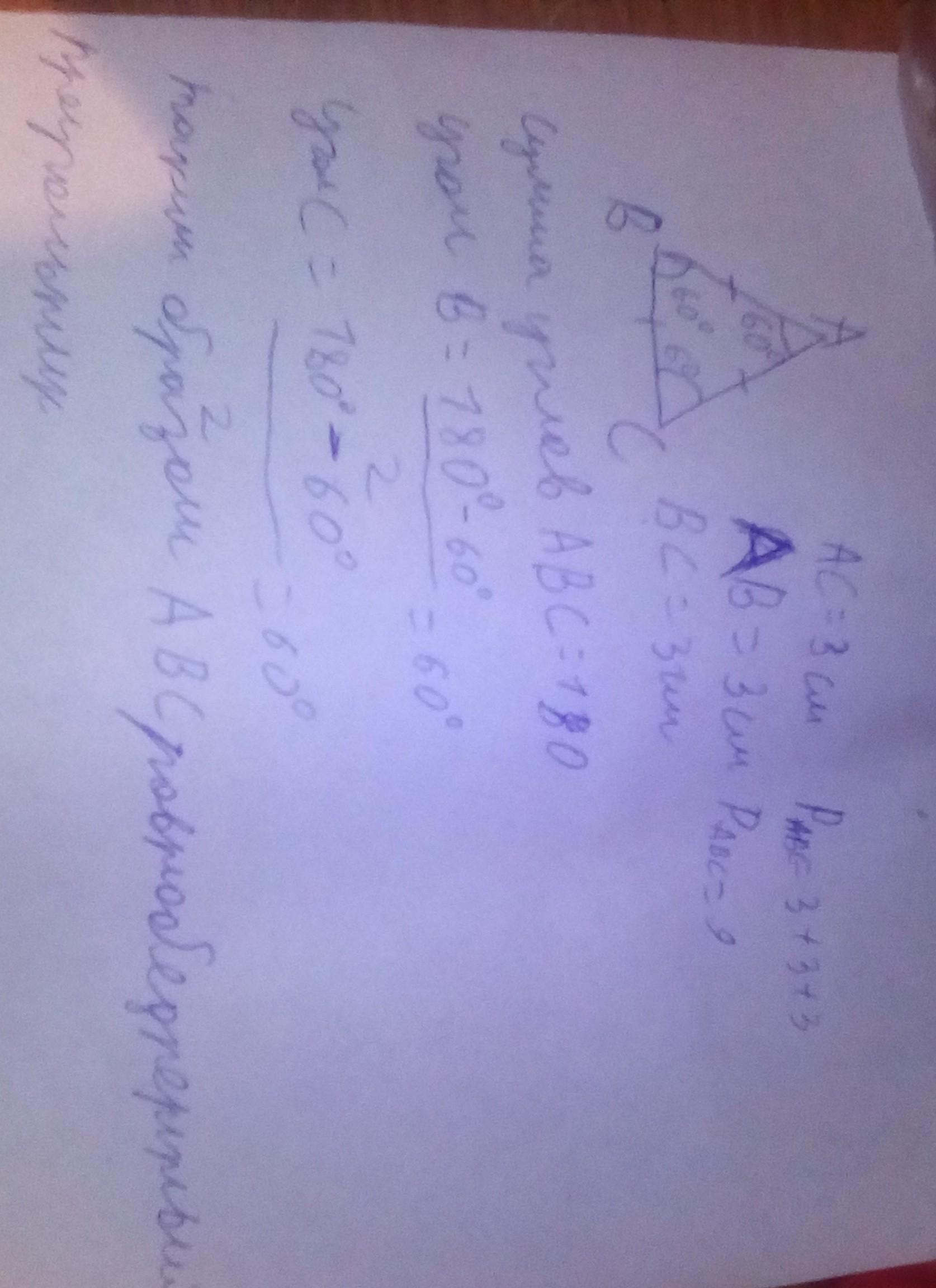 Углы у основания равнобедреного треугольника равны получается что все углы равны60. таким образом треугольник авс равнобедренный все