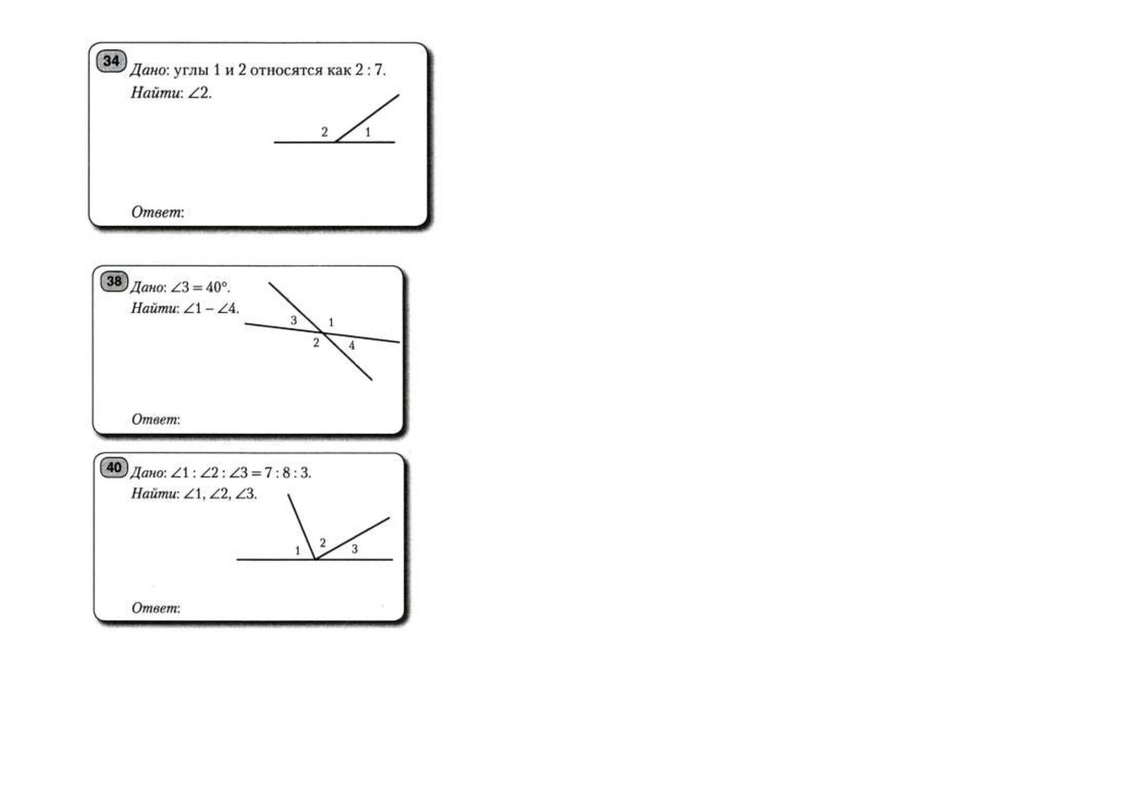 3. 7:8:3 - отношение, пусть 1 часть - х. углы 1,2,3 - смежные. 180 ÷ (7+8+3) = 10. х = 10. угол 1 = 10 × 7 = 70, 2 = 10 × 8 = 80, 3 = 10 × 3 = 30