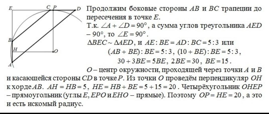 В трапеции ABCD основания AD и ВС относятся как 5 : 3 , а сумма углов при основании равна 90". Найдите радиус окружности, проходящей через точки А и B и касающейся прямой CD, если ab =8
