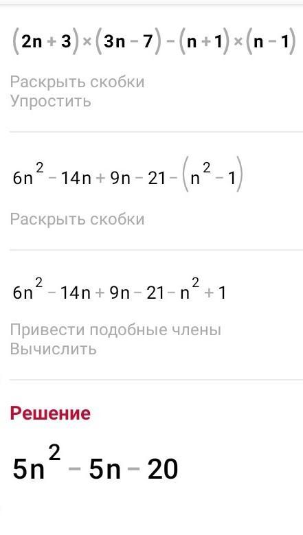 (2n + 3)(3n - 7) - (n + 1)(n - 1) = 6n² - 14n + 9n - 21 - (n² - 1) =