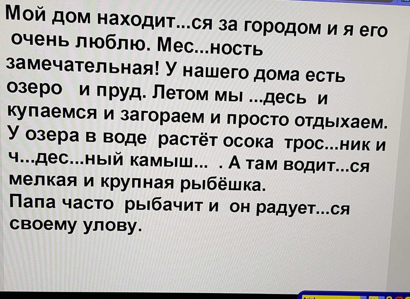 Мой дом находится за городом и я его очень люблю . Местность замечательная! У нашего дома есть озеро и пруд. Летом мы здесь и купаемся и загораем и просто отдыхаем. У озера в воде растёт осока, тростник и чудесный камыш. А там водится мелкая и крупная рыбёшка.