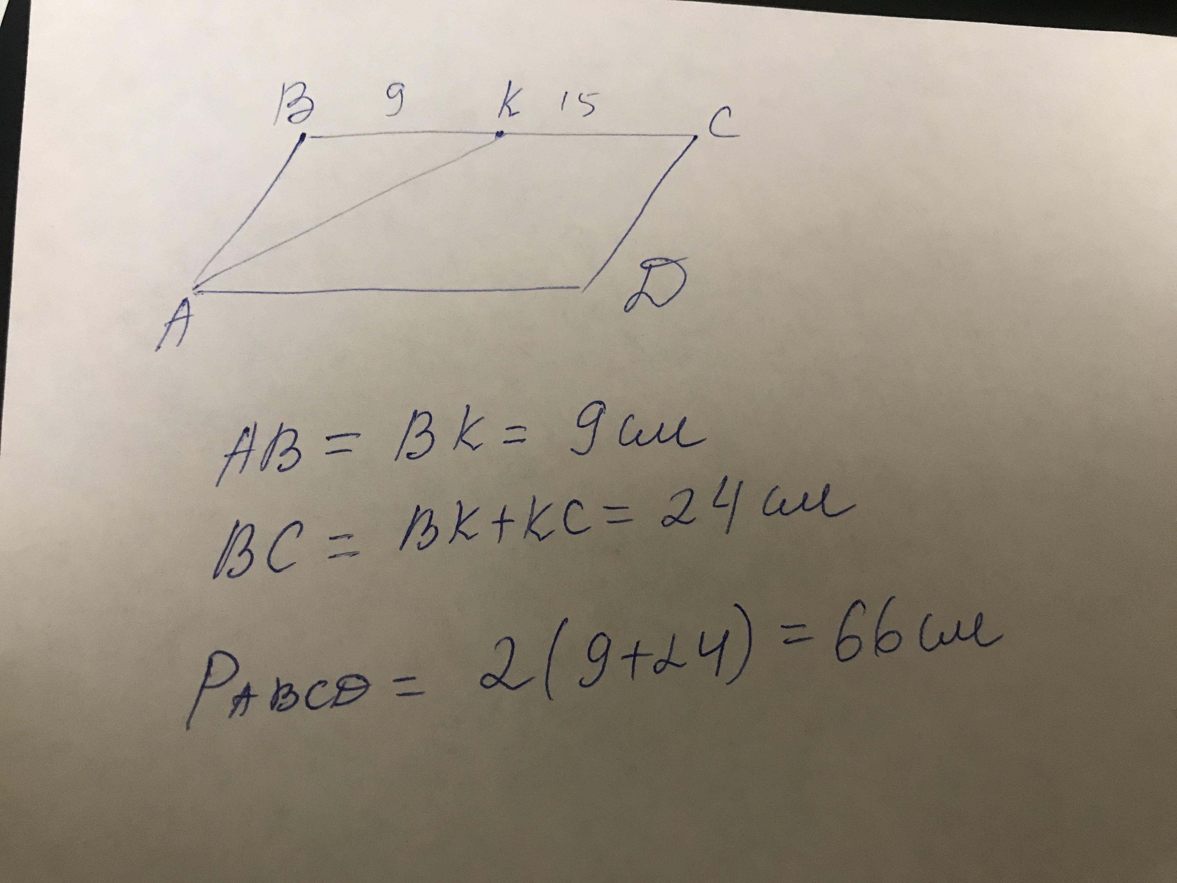 Биссектриса ∠A параллелограмма ABCD пересекает сторону BC и делит ее на отрезки длиной 9 и 15. Найдите периметр параллелограмма.