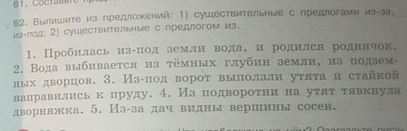 выпишите из предложений: 1) существительные с предлогами из-за, из-под; 2) существительные с предлогом из.