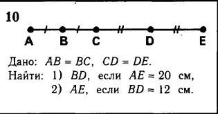 1) если АВ=ВС, а СД=ДЕ, то ВС+СД=АВ+ДЕ, поэтому ВС+СД=ВД; ВД=АВ+ДЕ. Так как АЕ=20см, то ВД=½×АЕ=½×20=10см