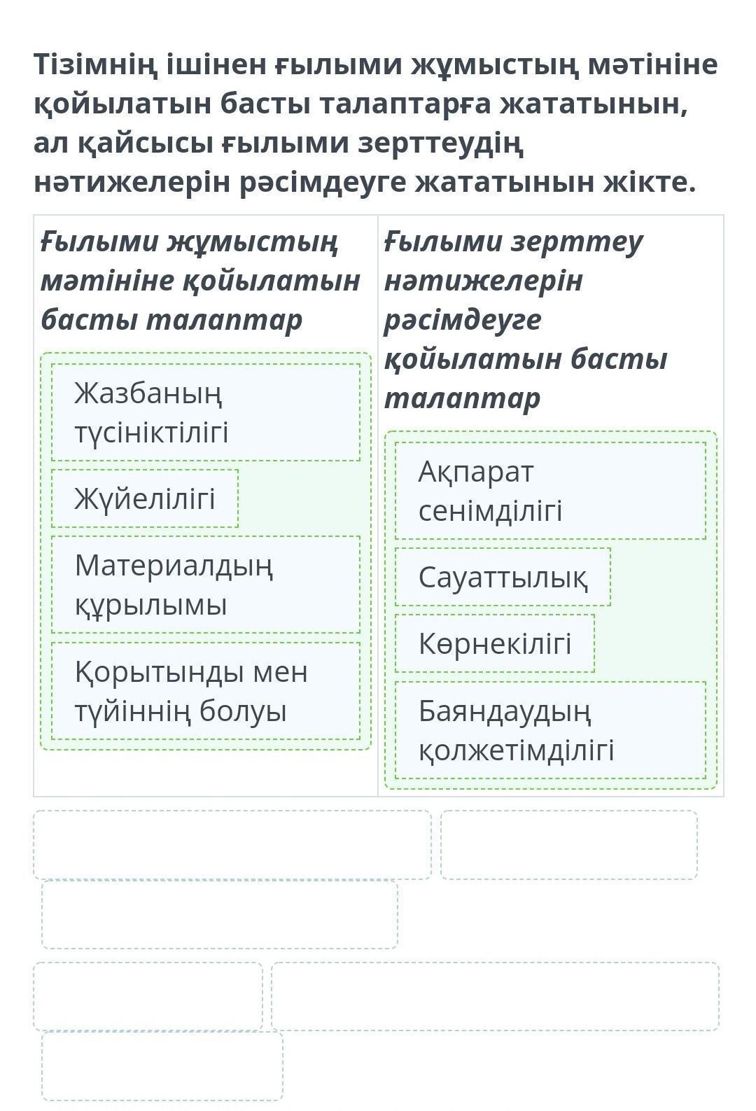 Тізімнің ішінен ғылыми жұмыстың мәтініне қойылатын басты талаптарға жататынын, ал қайсысы ғылыми зерттеудің нәтижелерін рәсімдеуге жататынын жікте.