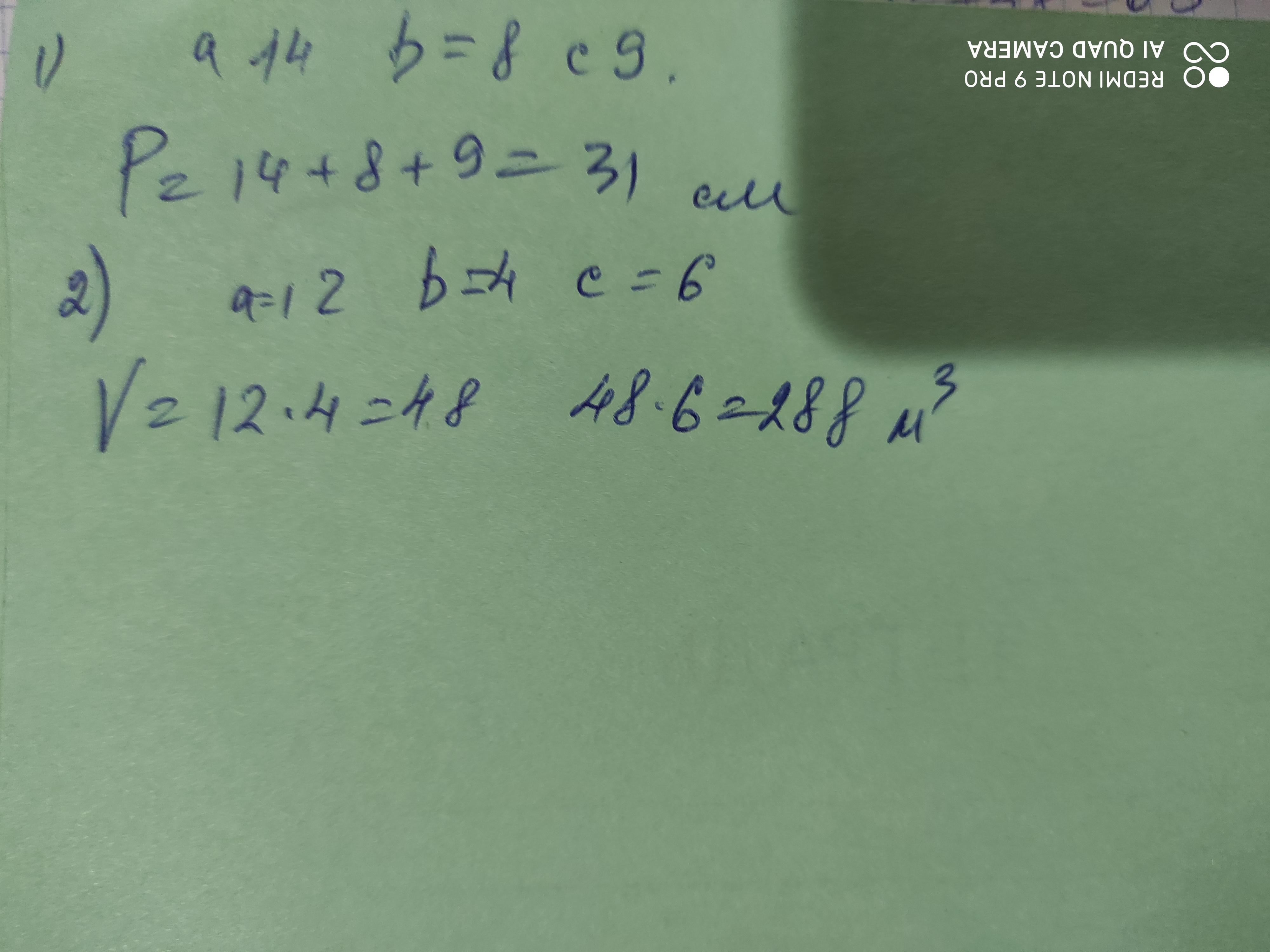 1. Найти периметр (p) треугольника со сторонами a, b, u, c если а=14м, b=8м, c=9м.