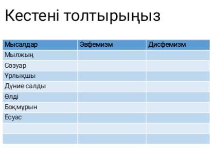 Дисфемизм:Мылжың, ұрлықшы , өлді, боқмұрын