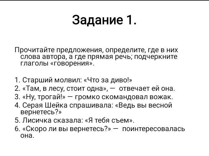 Прочитайте предложения определите где в них слова автора, а где прямая речь подчеркните глаголы говорения