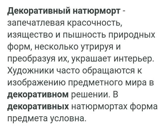 Декоративный натюрморт - запечатлевая красочность, изящество и пышность природных форм, несколько утрируя и преобразуя их, украшает интерьер. Художники часто обращаются к изображению предметного мира в декоративном решении.