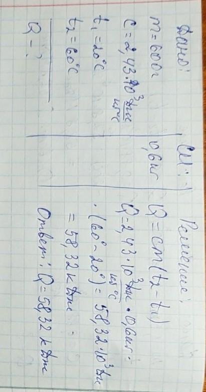 Какое количество теплоты требуется для нагревания 600г глицерина от температуры 20°С до температуры 60°С