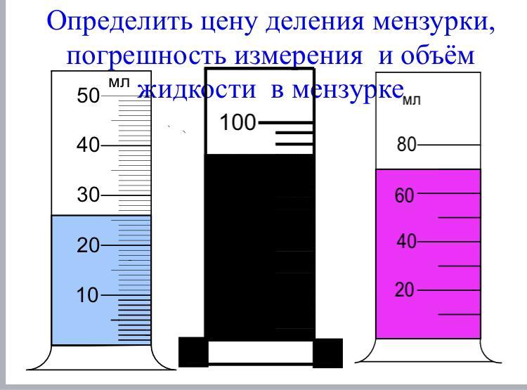 определить цену деления мензурки, погрешность измерения и объем жидкости в мензурке.
