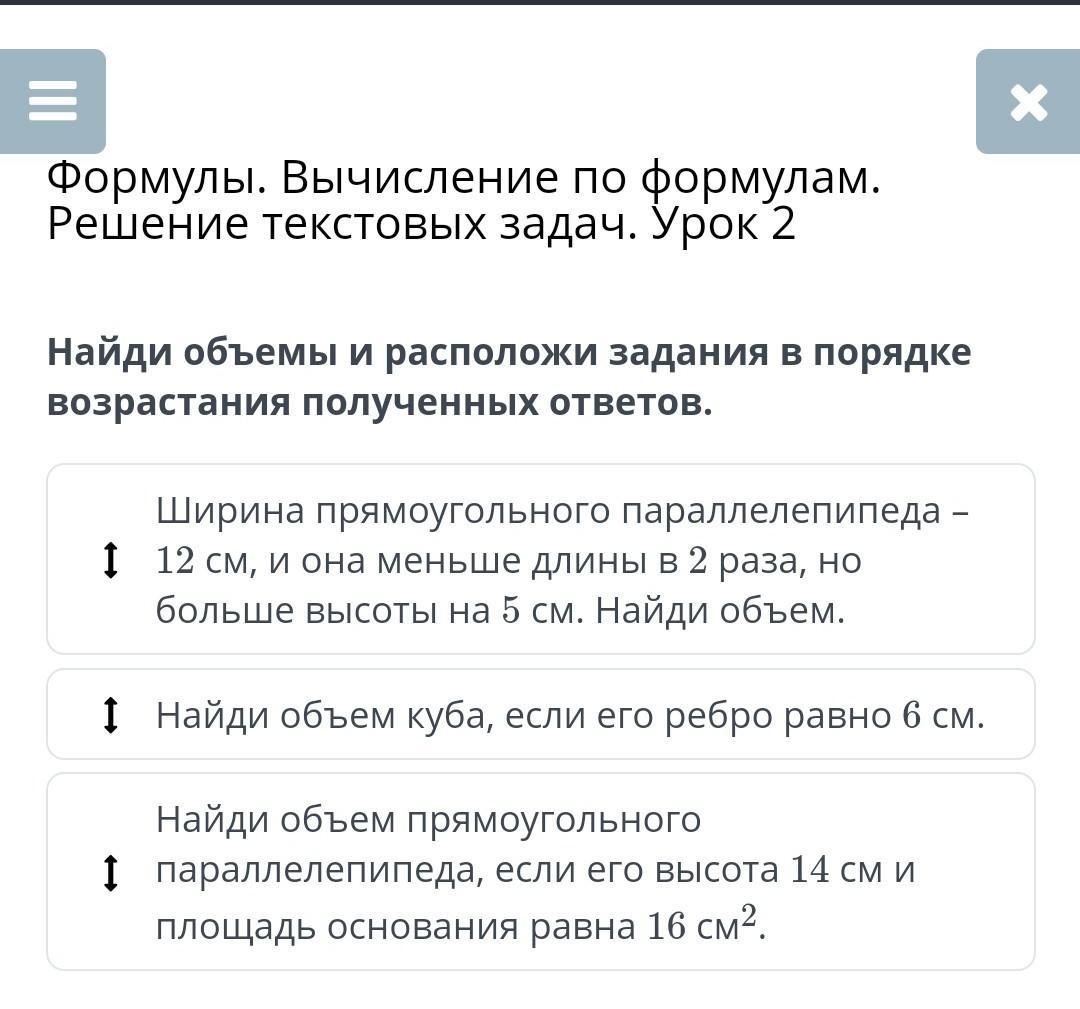 Найди объемы и расположи задание в порядке возрастания полученных ответов