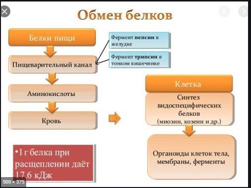 Изобразите в виде схемы процесс обмена белков от поступления их в организм с пищей (через образование собственных белков) до их старения и разложения с полученной энергии. По возможности укажите ферменты и органоиды.