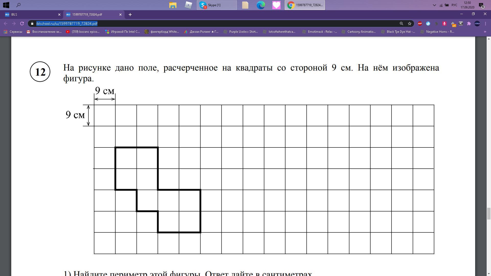 На рисунке дано поле, расчерченное на квадраты со стороной 9 см. На нём изображена