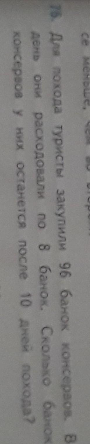 для похода туристы закупили 96 банок консервов в день они расходовали по восемь банок сколько банок консервов у них останется после 10 дней похода. помогите со схемой к этой задачи.