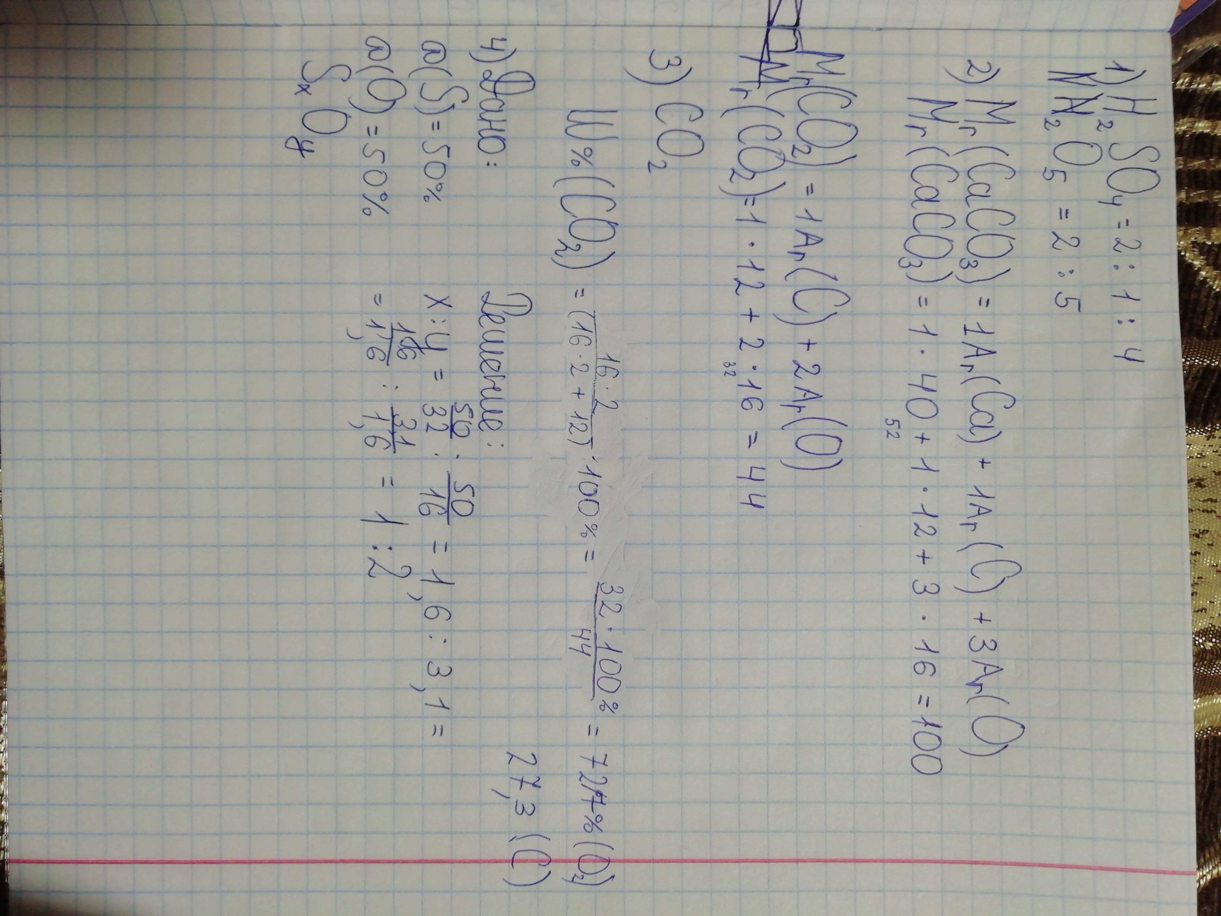 1.Определи численное соотношение атомов для молекул: H2SO4 , N2O5 (2 балла) 2. Определи относительную молекулярную массу вещества : CaCO3, CO2 (2 балла) 3.По формуле вещества СО2 вычислите массовые доли каждого химического элемента, который входит в состав вещества (3 балла) 4.Составьте формулу вещества, если массовые доли элементов в соединении таковы: ɷ(S) = 50% ( 0,5) и ɷ(О) = 50% (0,5)