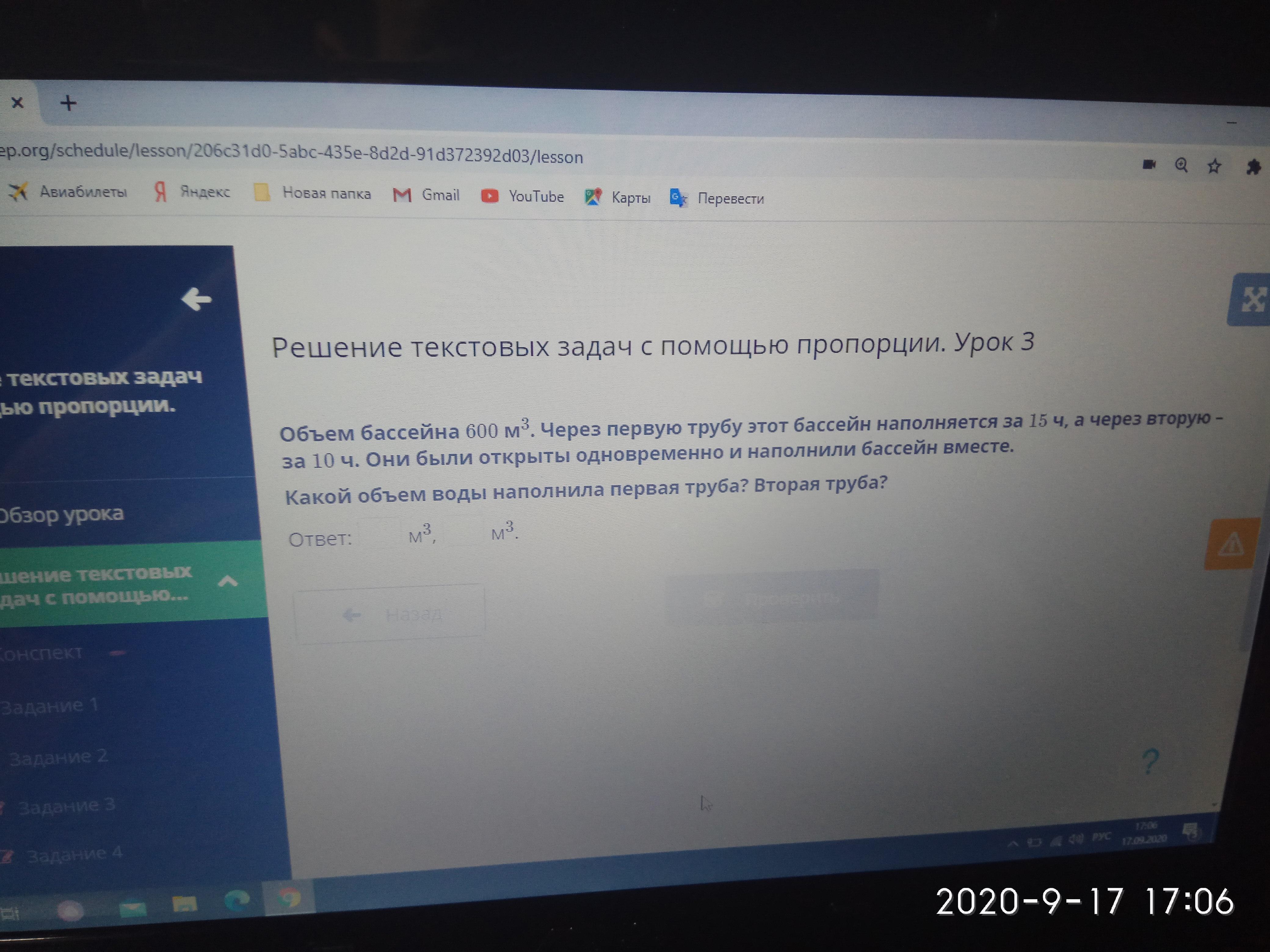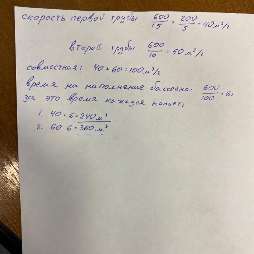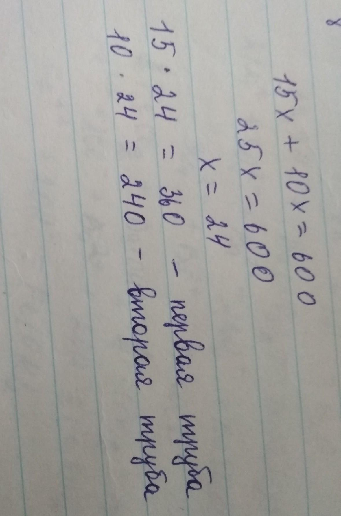 15x+10x=600, 25x=600, x=24, тогда 15•24=360- первая труба, 10•24=240- вторая