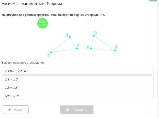 На рисунке два равных треугольника. Выбери неверное утверждение.