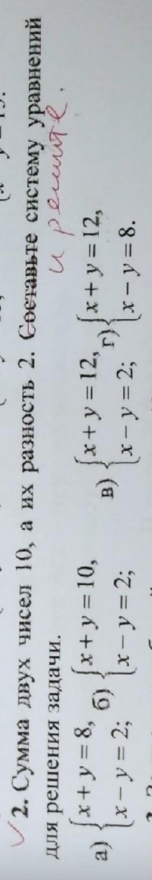 сумма двух чисел 10, а их разность 2. составьте и решите систему уравнений для решения задачи. ПОМОГИТЕ ПОЖАЛУЙСТА, СРОЧНО
