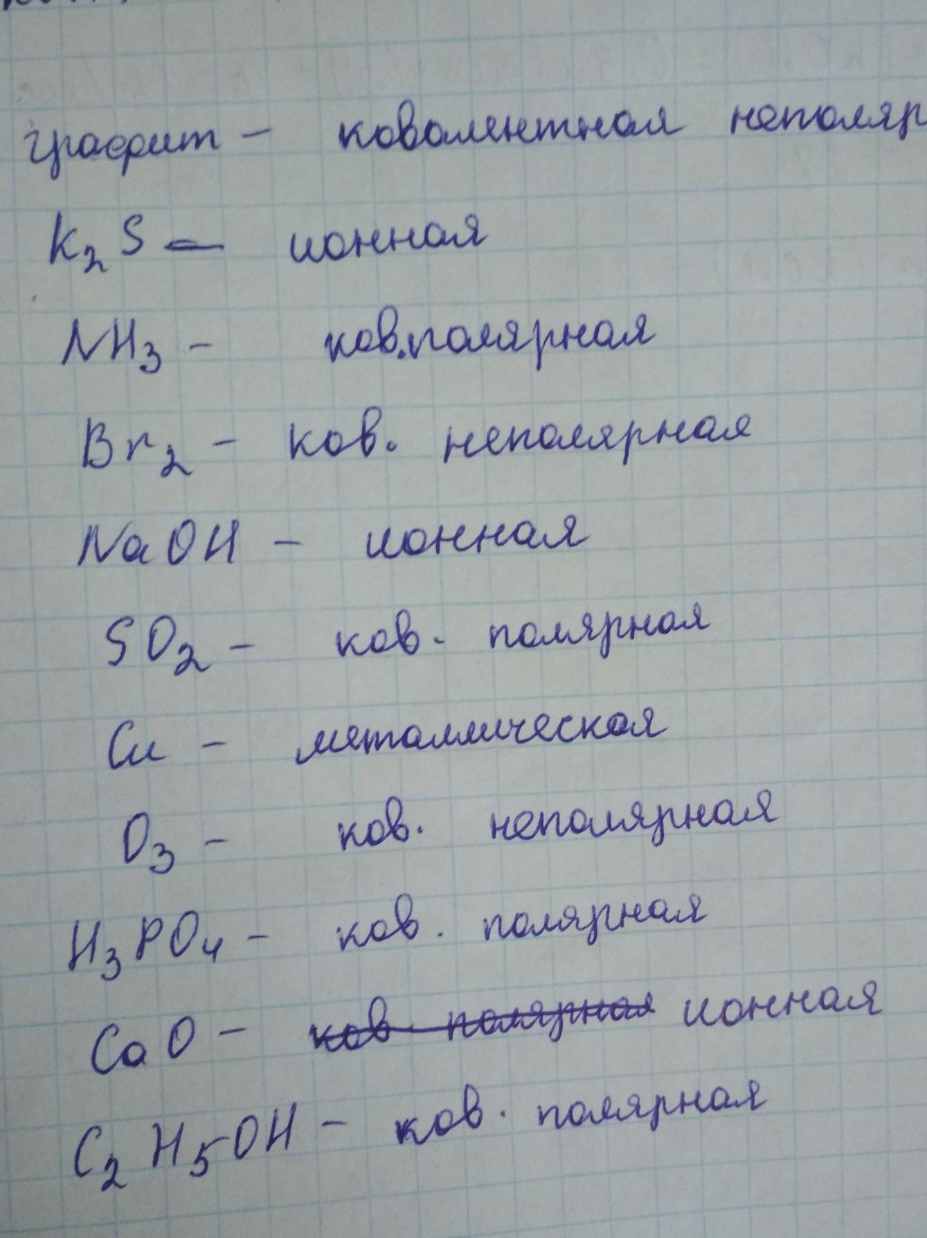 графит, Fe, K2S, NH3, Br2, NaOH, SO2, Cu, O3, H3PO4, CaO, C2H5OH