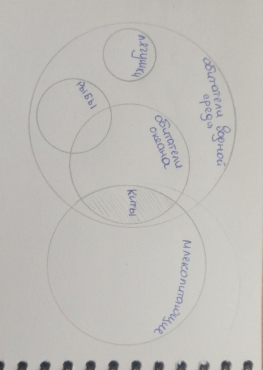 Изобразите при помощи кругов Эйлера соотношение понятий: «обитатели водной среды», «млекопитающие», «рыбы», «обитатели океана», «лягушки», «киты»