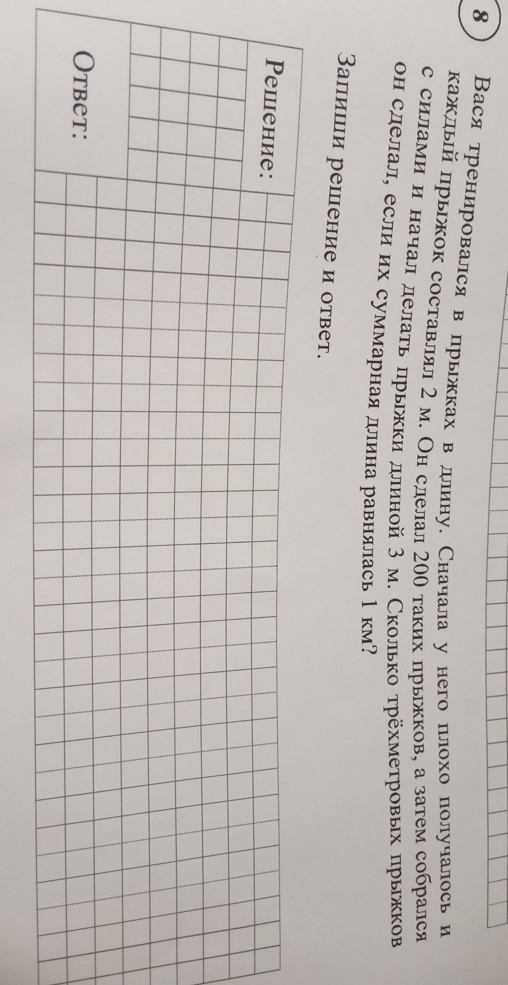 1) 2*200=400 (м) 2-х метровые прыжки ;2) 1000-400=600( м) осталось для 3-х метровых прыжков ;3)600:3=200 (раз прыгнул по 3 метра)
