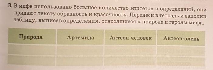 таблицу, выписав определения, относящиеся к природе и героям мифа.