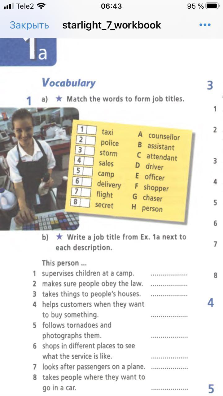 1 - camp counsellor, 2-police officer, 3- delivery person, 4-sales assistant, 5-storm chaser, 6-secret shopper, 7-flight attendant, 8-taxi driver
