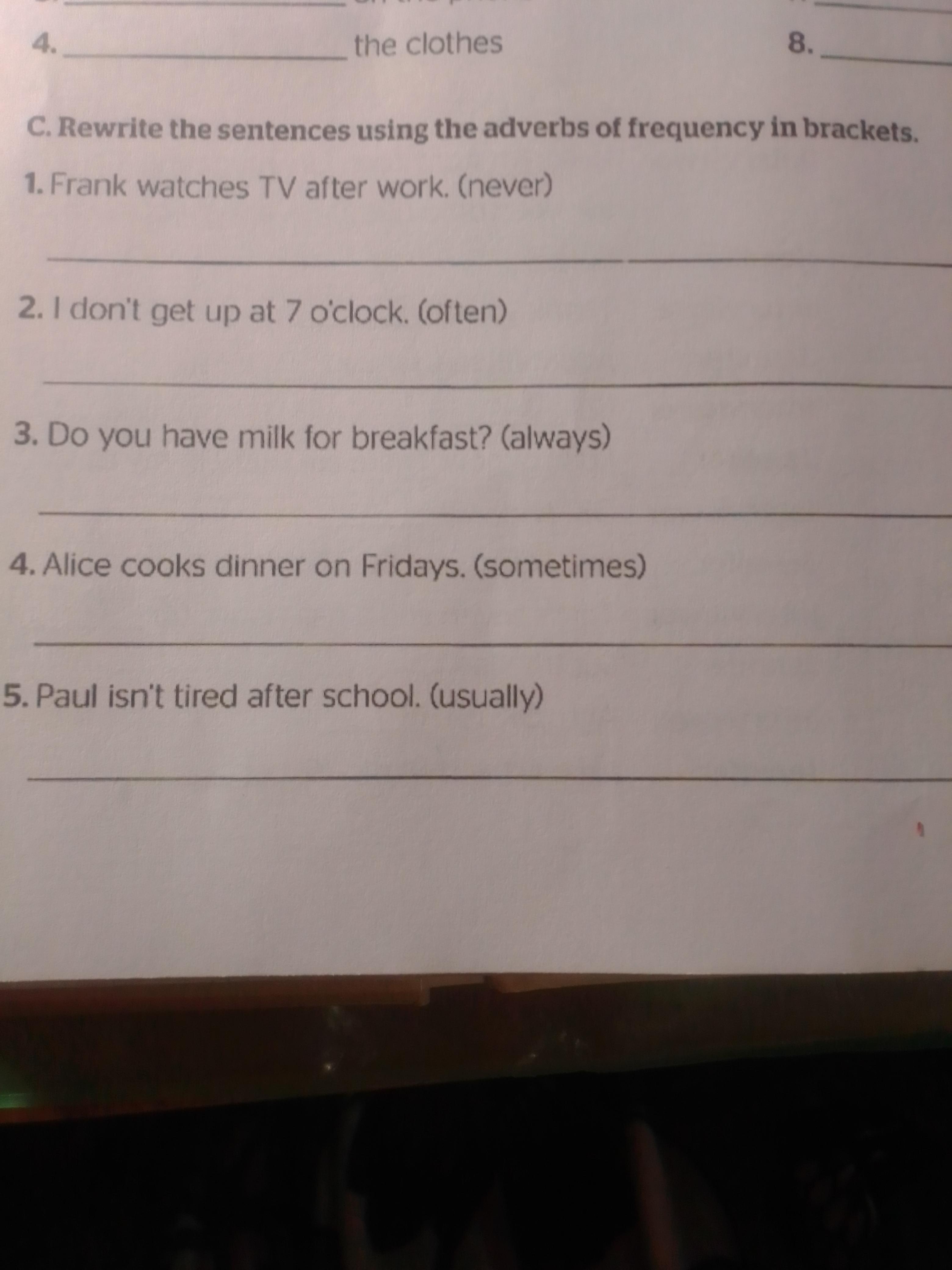 Frank never watches TV after work. I often don't get up at 7 o’clock.