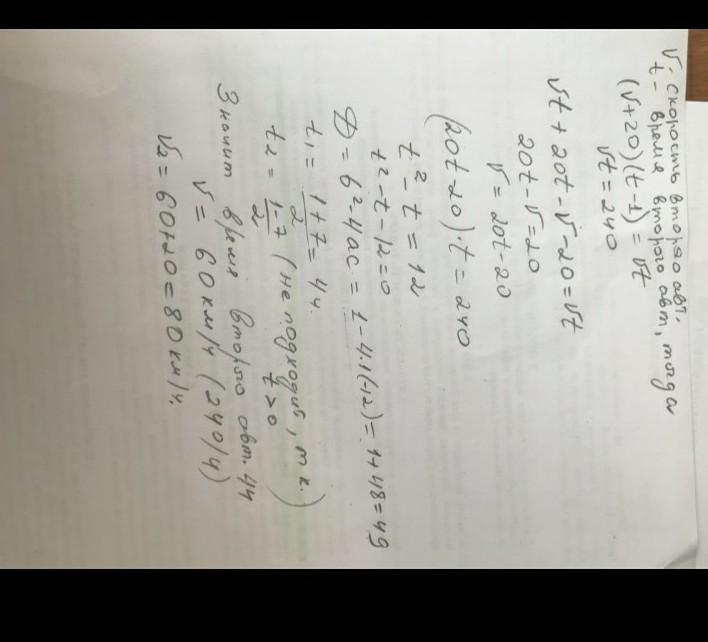 Путь в 240 км один автомобиль проежает на 1 час быстрее второго. Найдите скорости каждого автомобиля, если скорость первого автомобиля на 20 км/ч Больше скорости второго