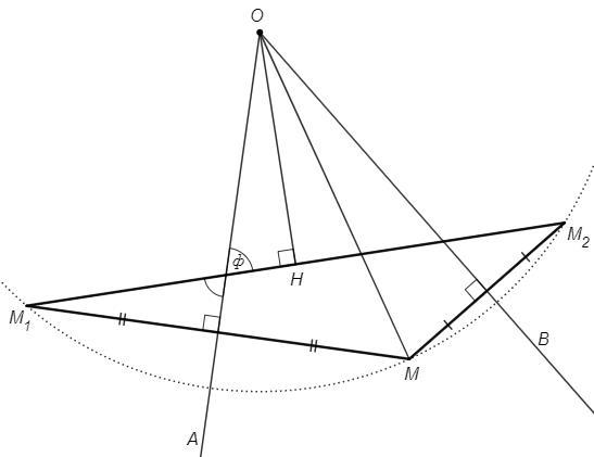 AO, BO - серединные перпендикуляры к сторонам △MM1M2, следовательно точка пересечения O является центром описанной окружности △MM1M2.