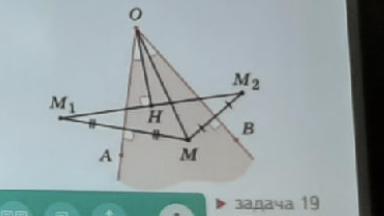 Точку М, лежащую внутри острого угла АОВ, симметрично отразили относительно его сторон и получили точки М1 и М2 (см. рисунок). На отрезок М1М2 из точки О опустили перпендикуляр ОН. Докажите, что углы АОН и ВОМ равны.