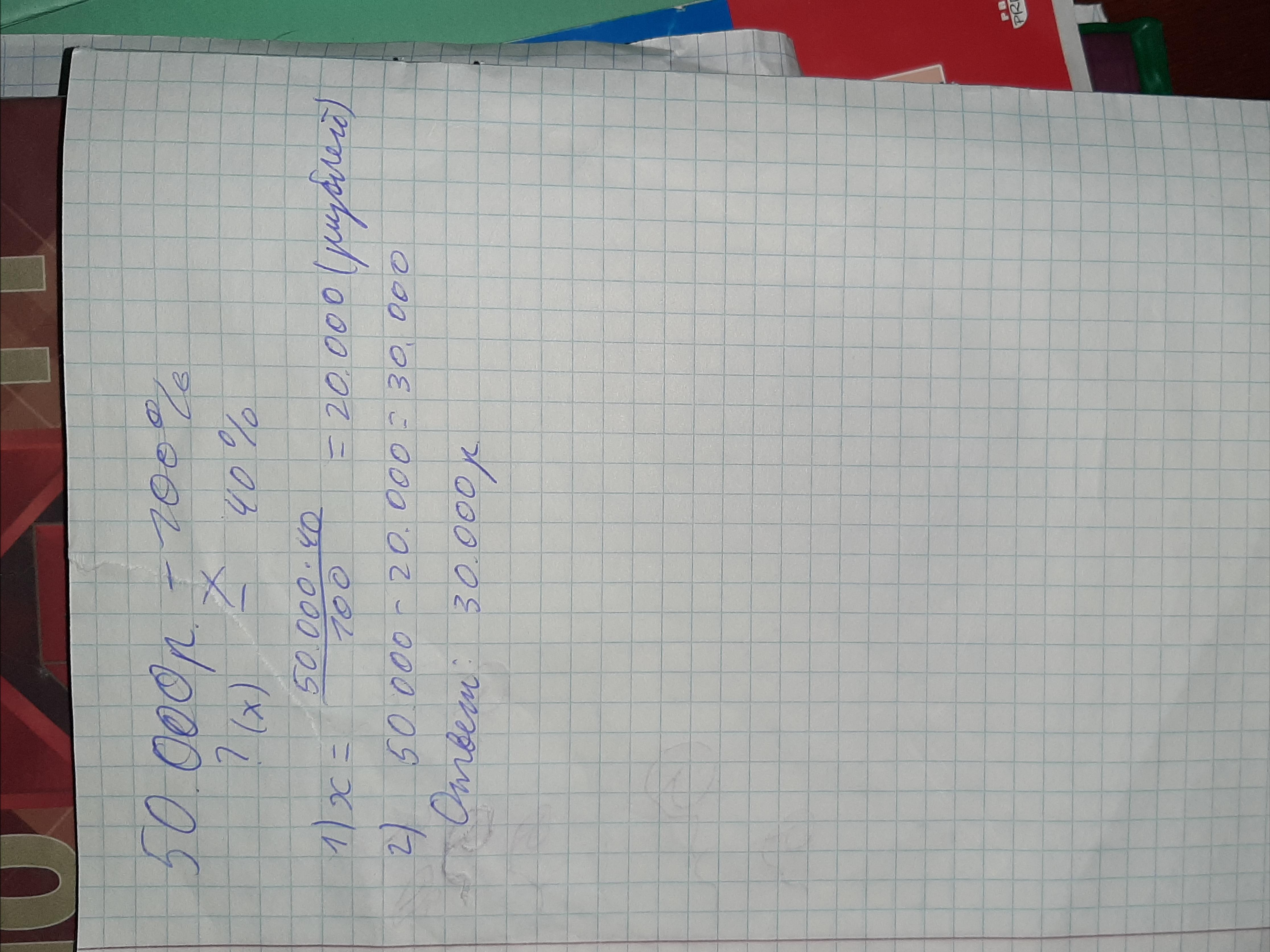 телевизор 50.000 рублей, а через год он подешевел на 40% сколько стал стоить телевизор? Ответ дайте в рублях.