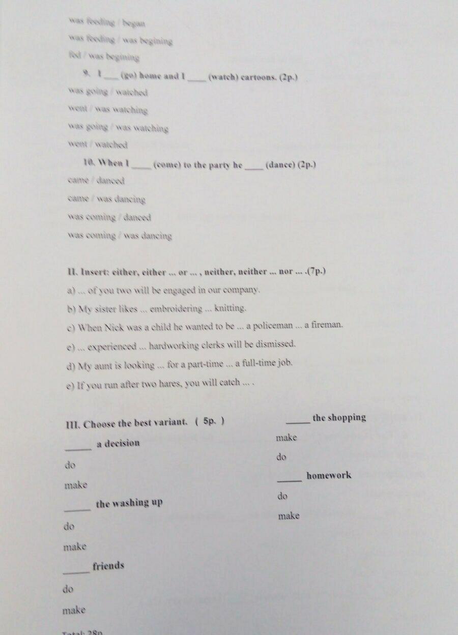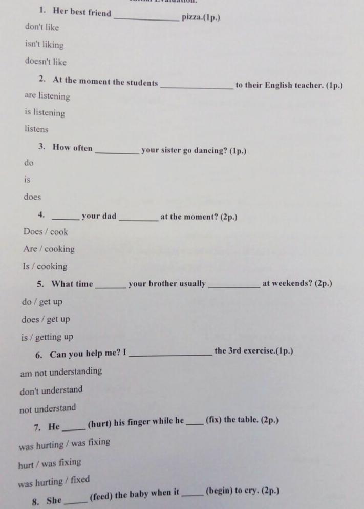 1-doesn't like, 2-are listening, 3-does, 4-is/cooking, 5-does/get up, 6-don't understand, 7-hurt/was fixing