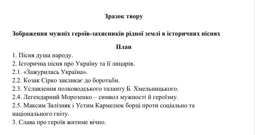 Написати твір на тему «Зображення мужніх героїв-захисників рідної землі в історичних піснях» за планом який закріплений в виді фото