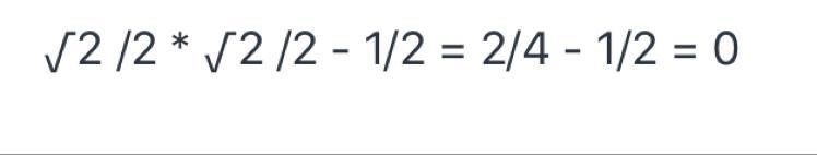 √2 /2 * √2 /2 - 1/2 = 2/4 - 1/2 = 0