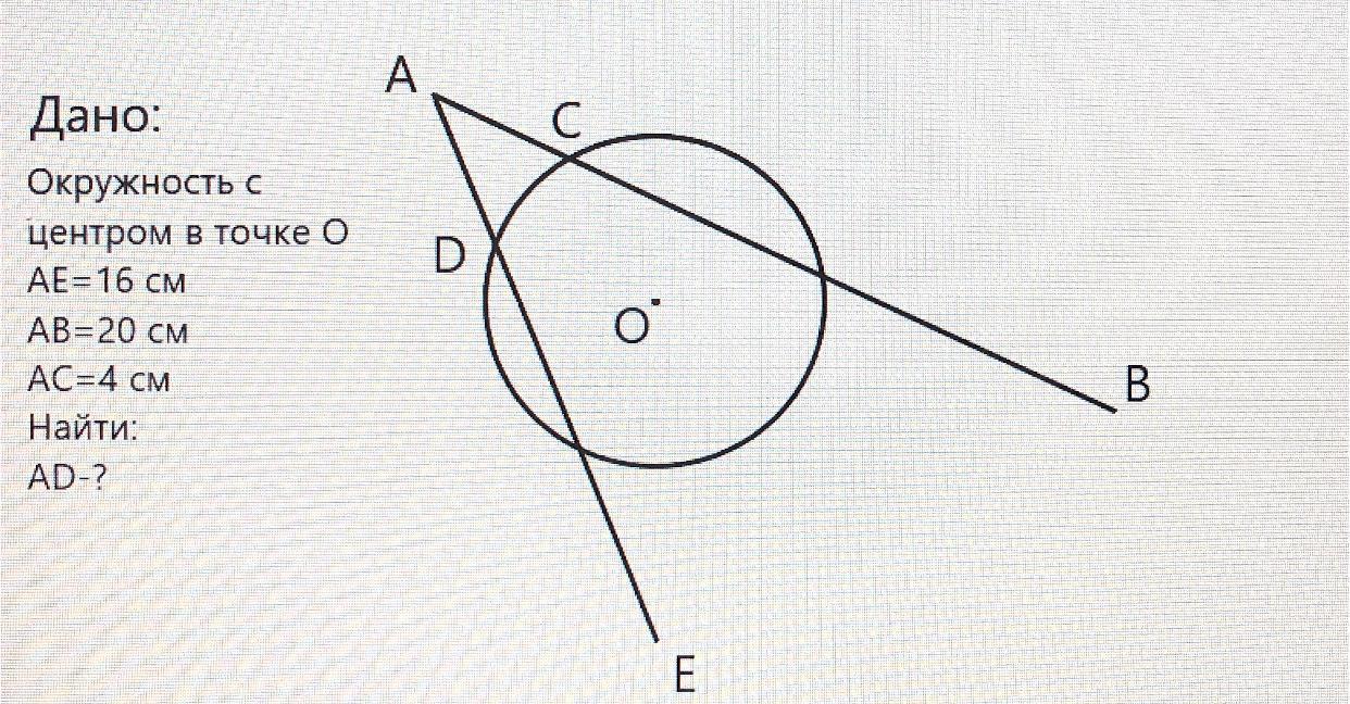 Из точки А к окружности проведены две секущие, пересекающие окружность в точках: С, В и D, Е . АВ = 20 см, АС = 4 см, АЕ = 16 см. Найти AD