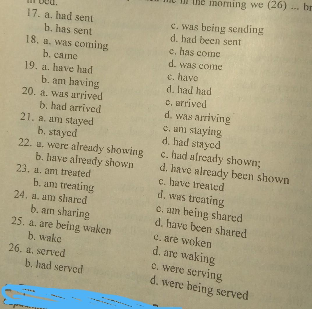 Well, I arrived safely but my luggage didn't! After many enquir- ies I found out that it (17) . to Finland instead of England! Anyway it finally (18) . three days ago and other than that, 1 (19) .. a great time ever since I (20).. The people I (21)... with are very nice and they (22) .. me all the local tourist sites. I (23)... here exactly like one of the family. I (24)... a room with Penny, the hosts' daughter, who is my age. Every morn- ing we (25) .. by her mother with a cup of tea! Fantastic! Yesterday when you phoned me in the morning we (26)...breakfast in bed.