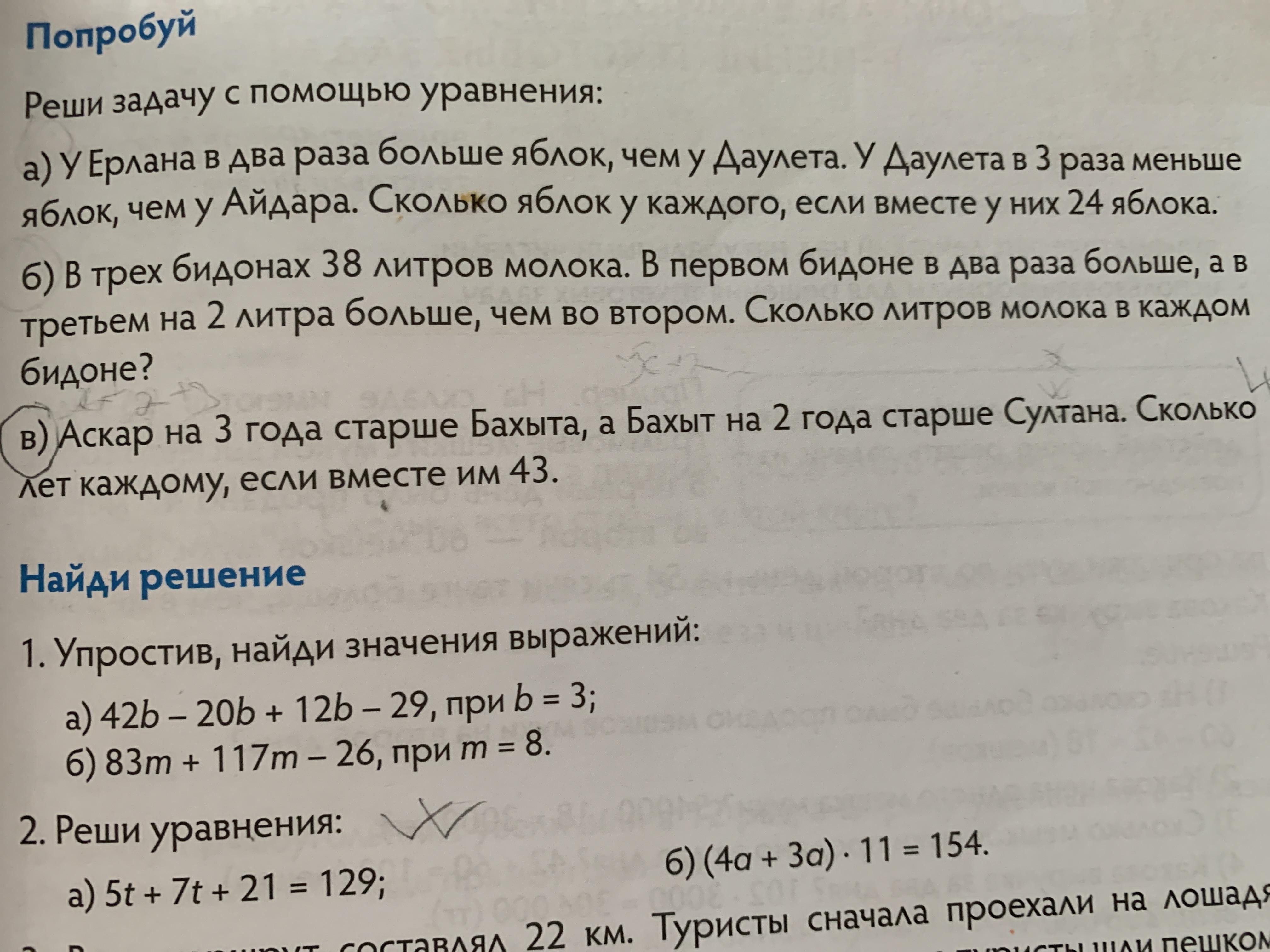 реши задачу с помощью уравнения: Аскар на 3 года старше Бахыта. а Бахыт на 2 года старше Султана. Сколько лет каждому если вместе им 43 (задача В)