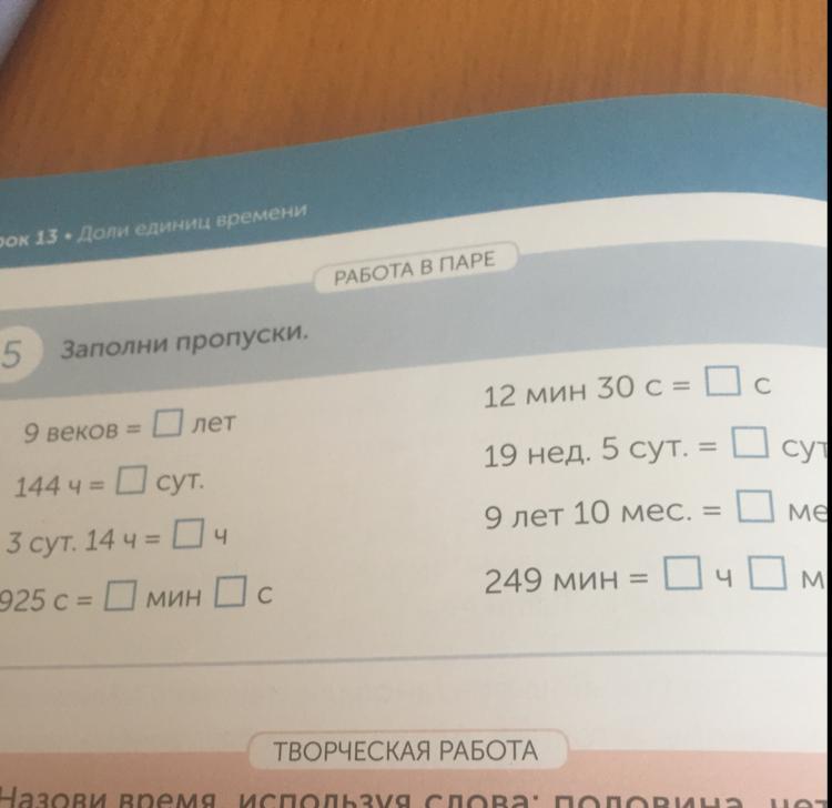 Заполни пропуски 9веков= 144= 3сут 14ч= 925с 12мин 30с= 19нед 5сут= 9лет 10мес. 249мин=. Помогите