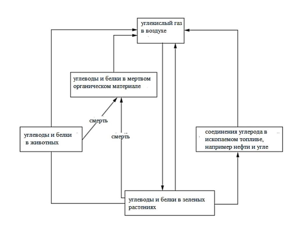 Обозначьте на схеме перечисленные процессы углеродного цикла возле стрелок.
