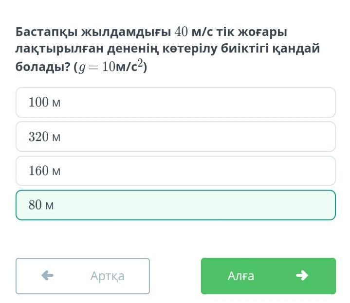 Бастапқы жылдамдығы 40м/с тік жоғары лақтырылған дененің көтерілу биіктігі қандай болады? (g=10м/c2)