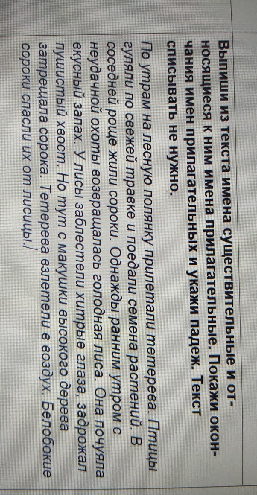 Лесную полянку (В.п.), свежей траве (Д.п.), соседней роще (П.п.), ранним утром (Т.п.), неудачной охоты (Р.п.), голодная лиса (Им.п.), вкусный запах (В.п.), хитрые глаза (Им.п.), пушистый хвост (Им.п.), высокого дерева (Р.п.), белобокие сороки (Им.п.)